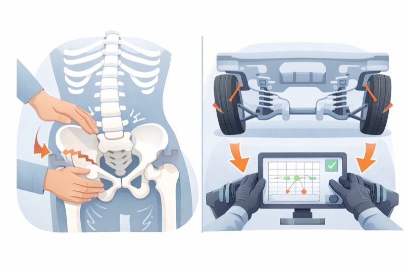 どんなに良い靴(新品タイヤ)を履いていても、骨盤が歪んでいれば歩きにくく、膝や腰を痛めてしまいますよね。車も同じです。アライメント(骨盤)がズレたまま走ると、タイヤが変な減り方をしたり、まっすぐ走れなくなったりします。